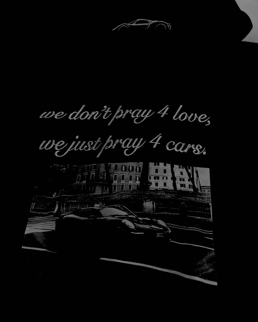 DiseΓ±o: En la parte frontal se encuentra la frase en bordado β€œwe don’t pray for love, we just pray for cars”, y en la parte traseraΒ el bordado del nombre de la marca y un detalle bordado deΒ un carro.